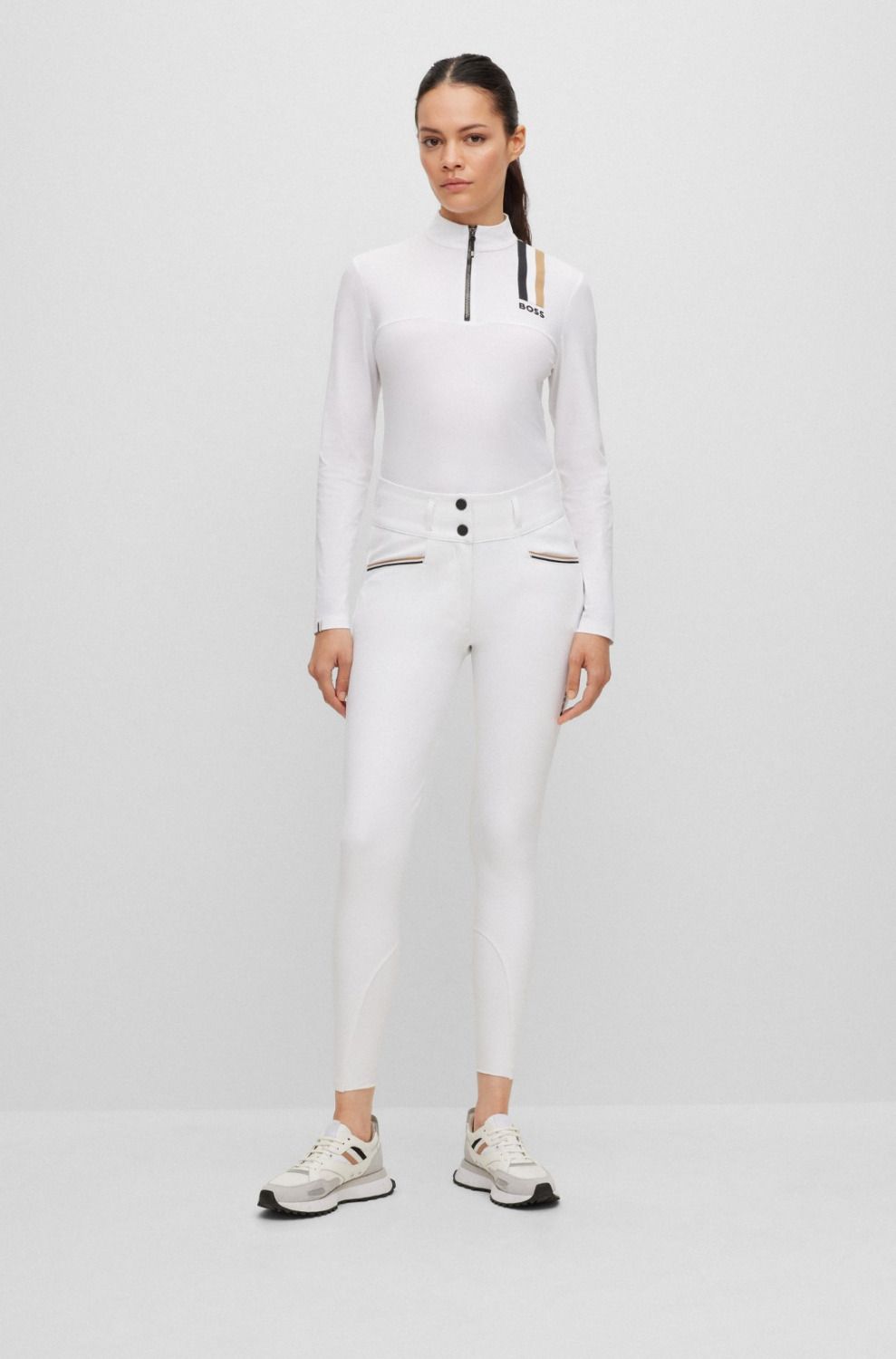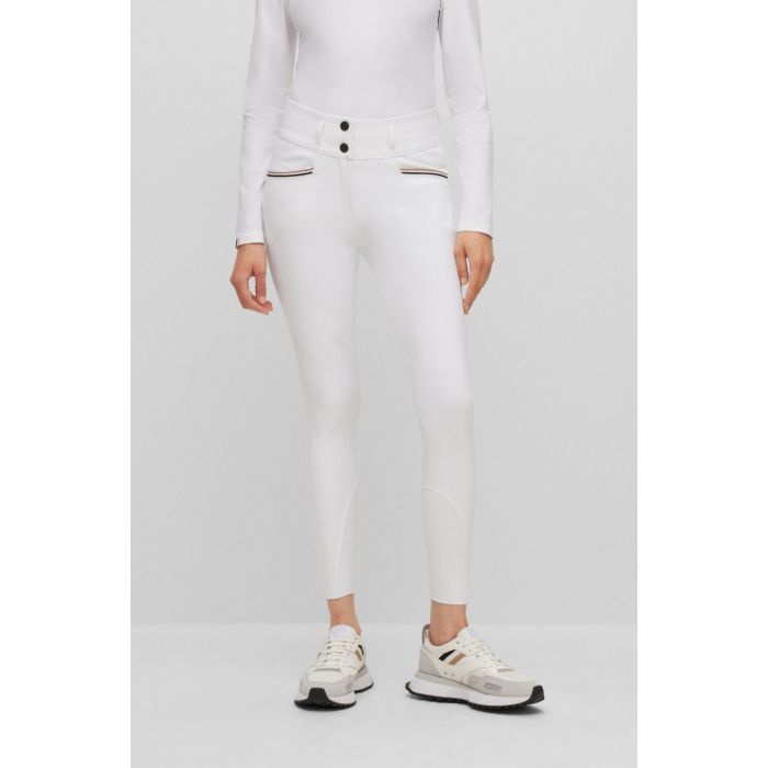 BOSS Equestrian HAILEY teljes ülőfelületen szilikonos nadrág széles derékpánttal. Légáteresztő Power Sport anyagból készült a maximális kényelem érdekében. Magasan kivágott derékrész, cipzár és 2 darab BOSS logó kapoccsal. A zsebek BOSS Signature Stripe szalaggal díszítve. Szilikon logó a bal combon. Hátsó övbújtató Signature Stripe szalaggal borítva. Kiváló minőségű és kényelmes szilikon full grip betét varrás nélkül. Jersey rugalmas betétek a lábszáron Silicon Grip Technology-val.