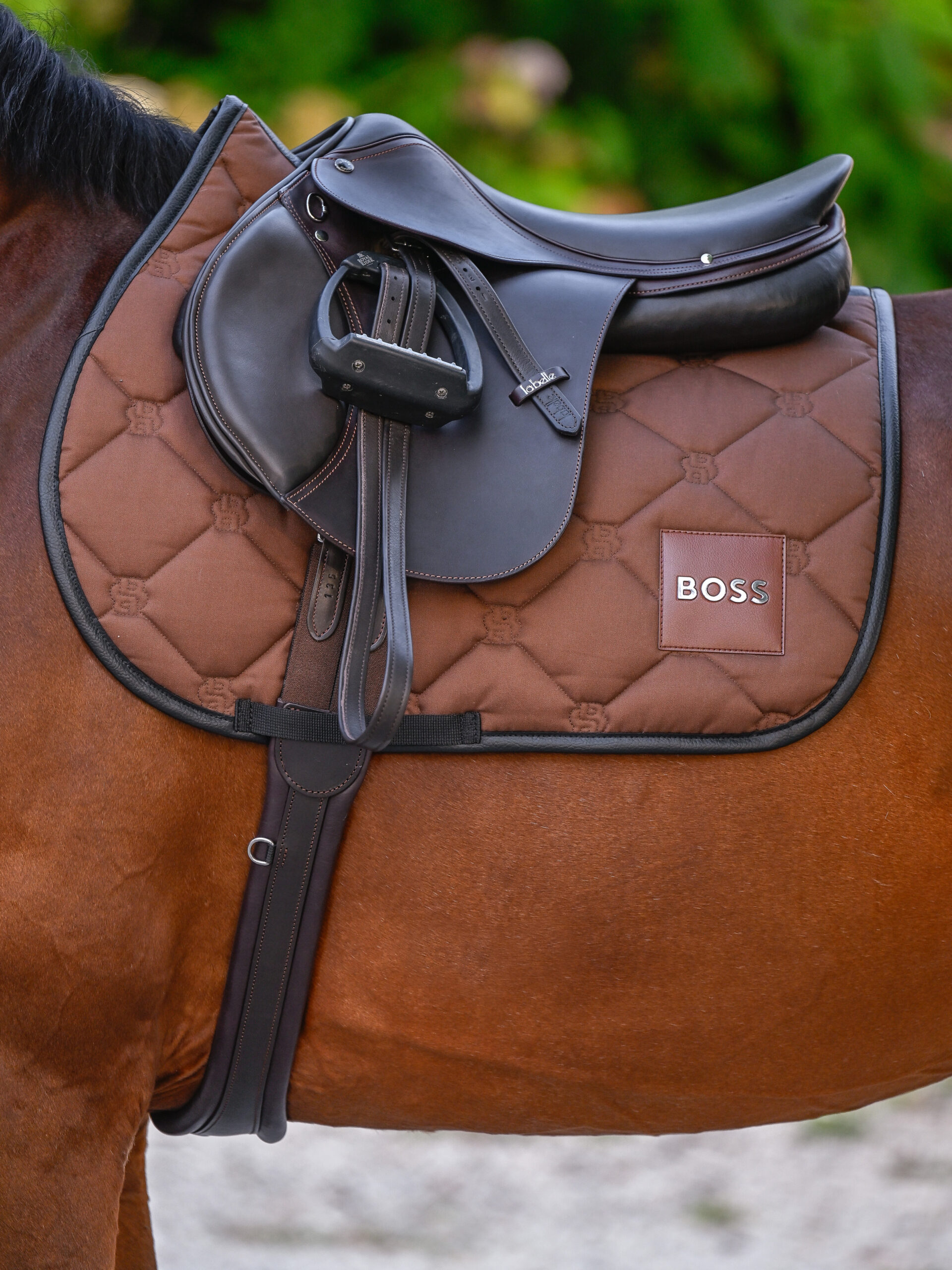BOSS Equestrian anatómiai kialakítású nyeregalátét dupla B betűs steppeléssel. Kiváló minőségű bőr BOSS logó tábla a bal oldalon, magas kivágás a marnál, szabadság a vállnál, optimális nyeregpozíció, nem csúszik el a lovaglás során. Rendkívüli nedvesség elvezető tulajdonsággal rendelkezik.