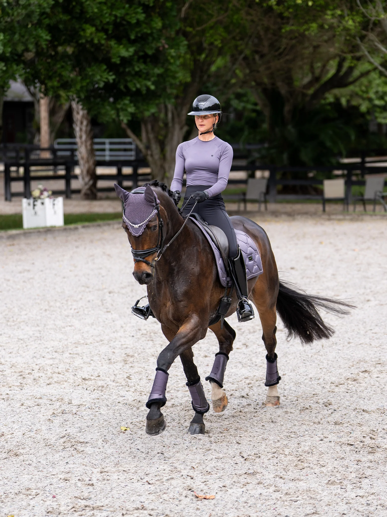 Elegáns Equestrian Stockholm fülvédő sötétlila színben, lila-ezüst zsinórral és ezüst fém táblával. A fülvédő megvédi lovunk fülét a bogaraktól és a zavaró hangoktól. Horgolt, elasztikus anyagú fülrésszel. Könnyen rögzíthető, nem mozdul el.
