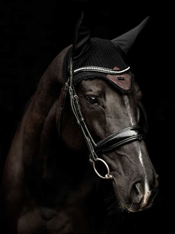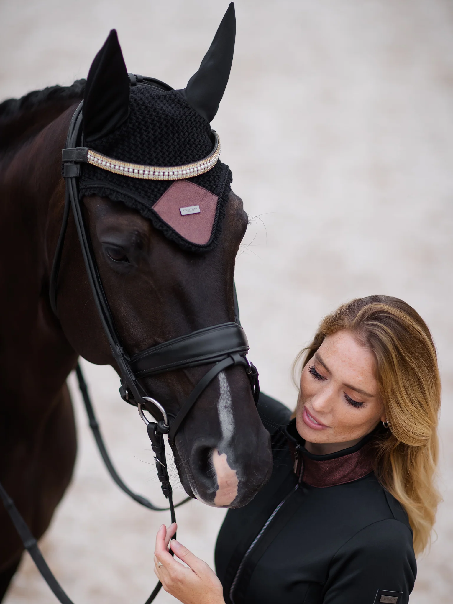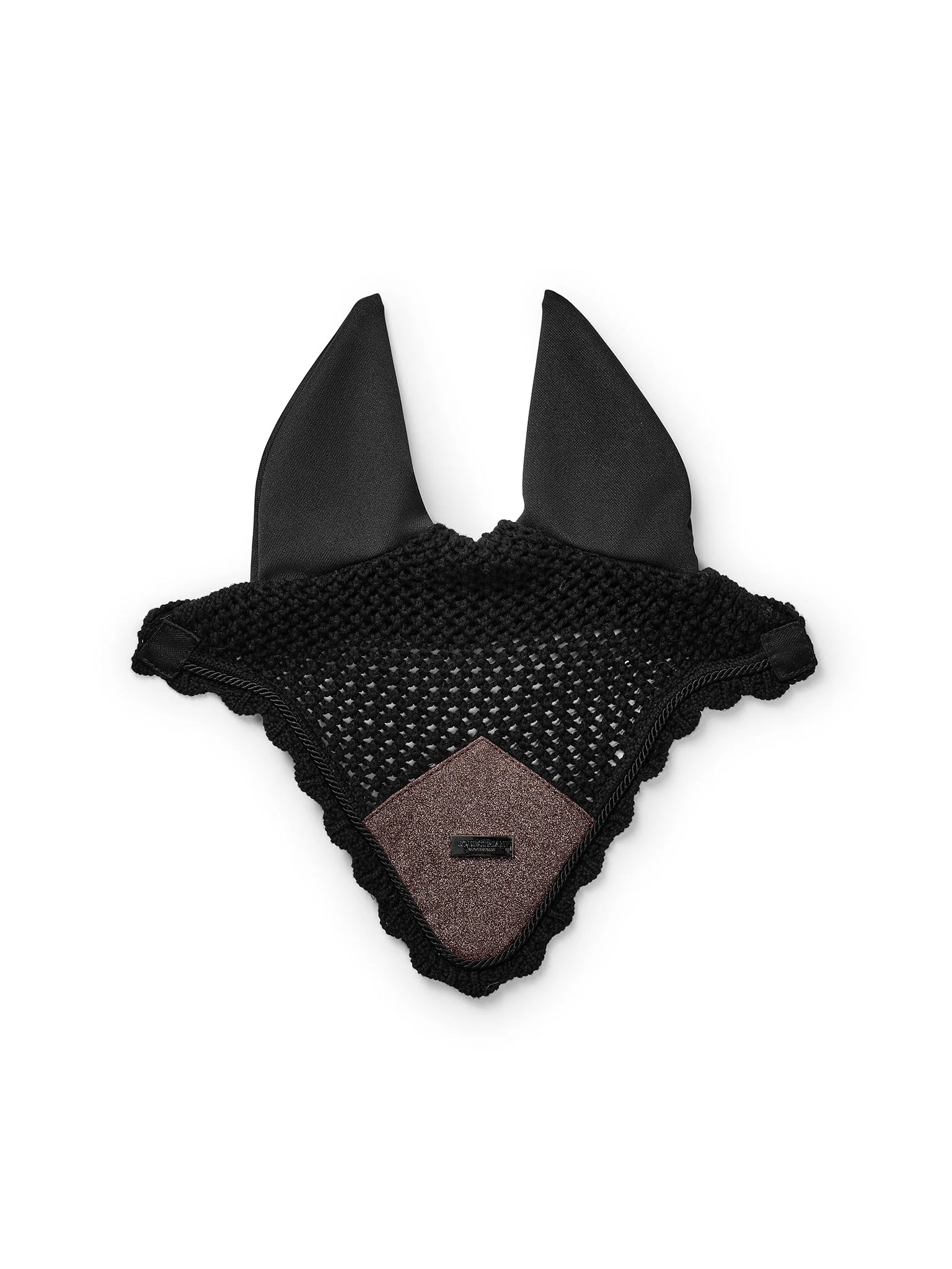 Elegáns fekete Equestrian Stockholm fülvédő mahagóni barna csillogó részletekkel az elején, fekete zsinórral és króm fém táblával. A fülvédő megvédi lovunk fülét a bogaraktól és a zavaró hangoktól. Horgolt, elasztikus anyagú fülrésszel. Könnyen rögzíthető, nem mozdul el.