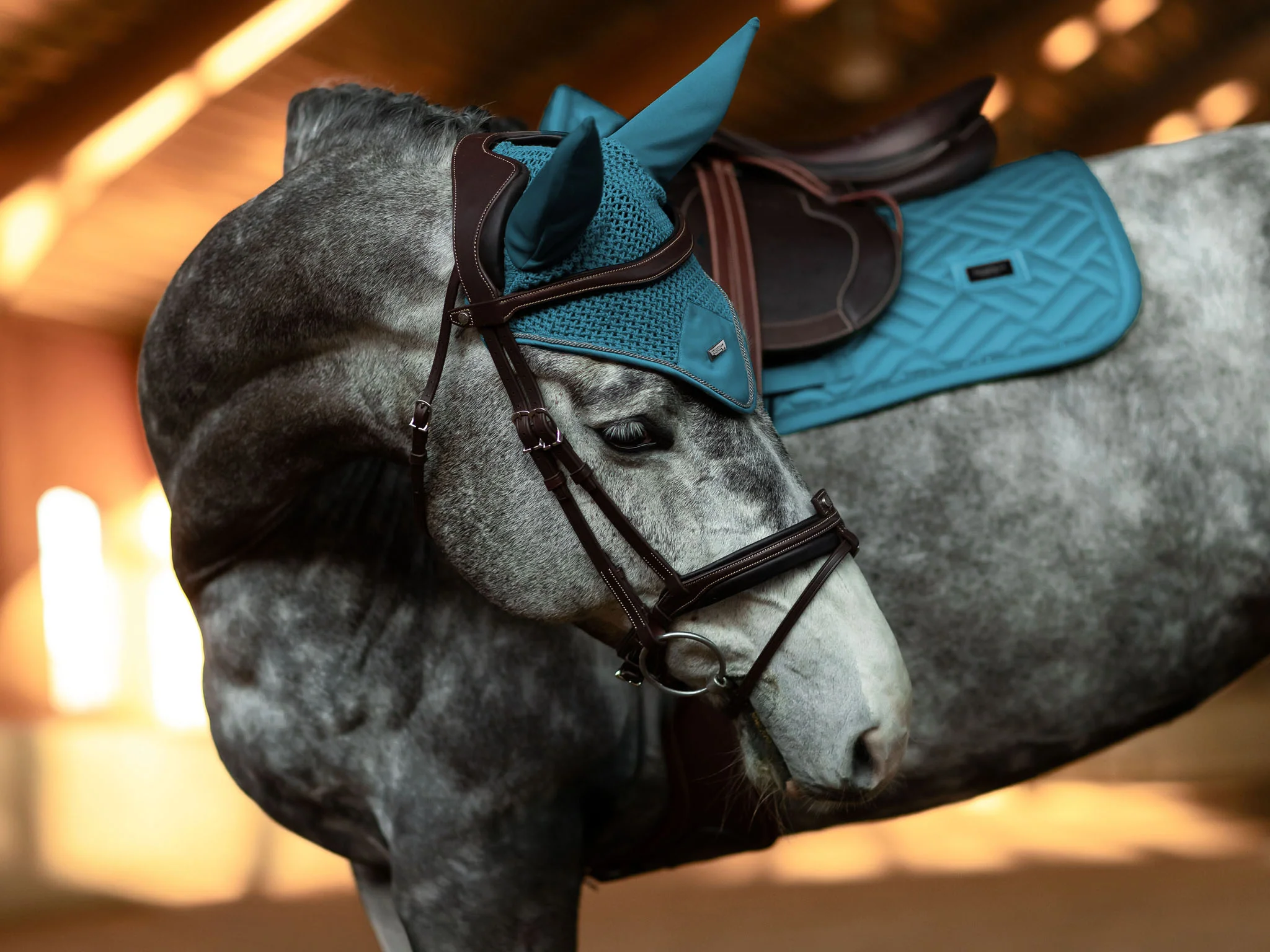 Elegáns Equestrian Stockholm fülvédő sötét zöldeskék színben, zöldeskék zsinórral és ezüst fém táblával. A fülvédő megvédi lovunk fülét a bogaraktól és a zavaró hangoktól. Horgolt, elasztikus anyagú fülrésszel. Könnyen rögzíthető, nem mozdul el.