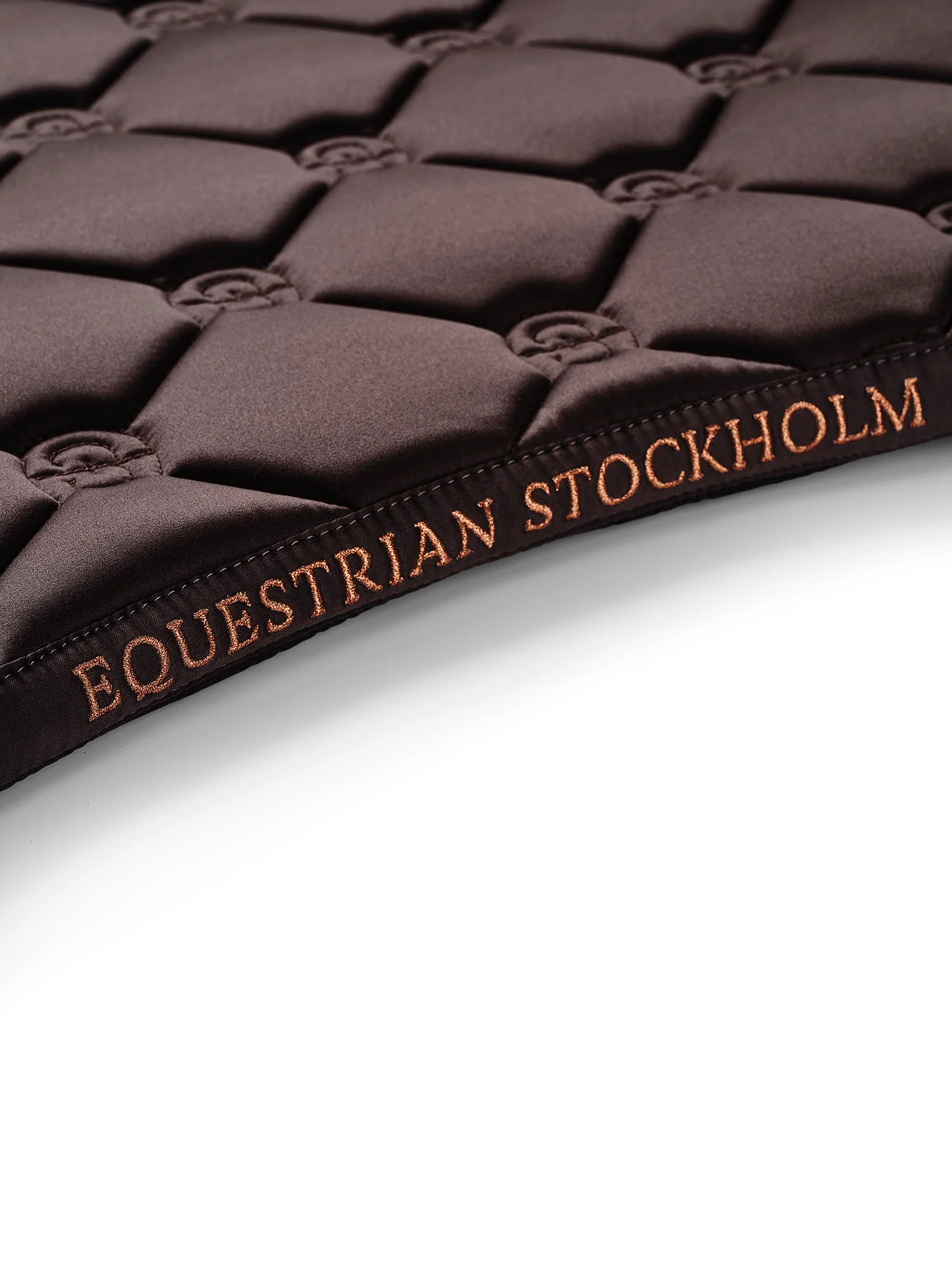 Elegáns Equestrian Stockholm nyeregalátét gyönyörű enyhén lilás barna színben, rose gold részletekkel. Rose Gold Equestrian Stockholm logó táblával az oldalán. Anyaga ‘High IQ cool comfort’ kezelt, amely a nyeregalátét gyors száradását és nedvességelvezető képességét biztosítja. Segít a lovunknak hosszabb ideig száraz és friss maradni.