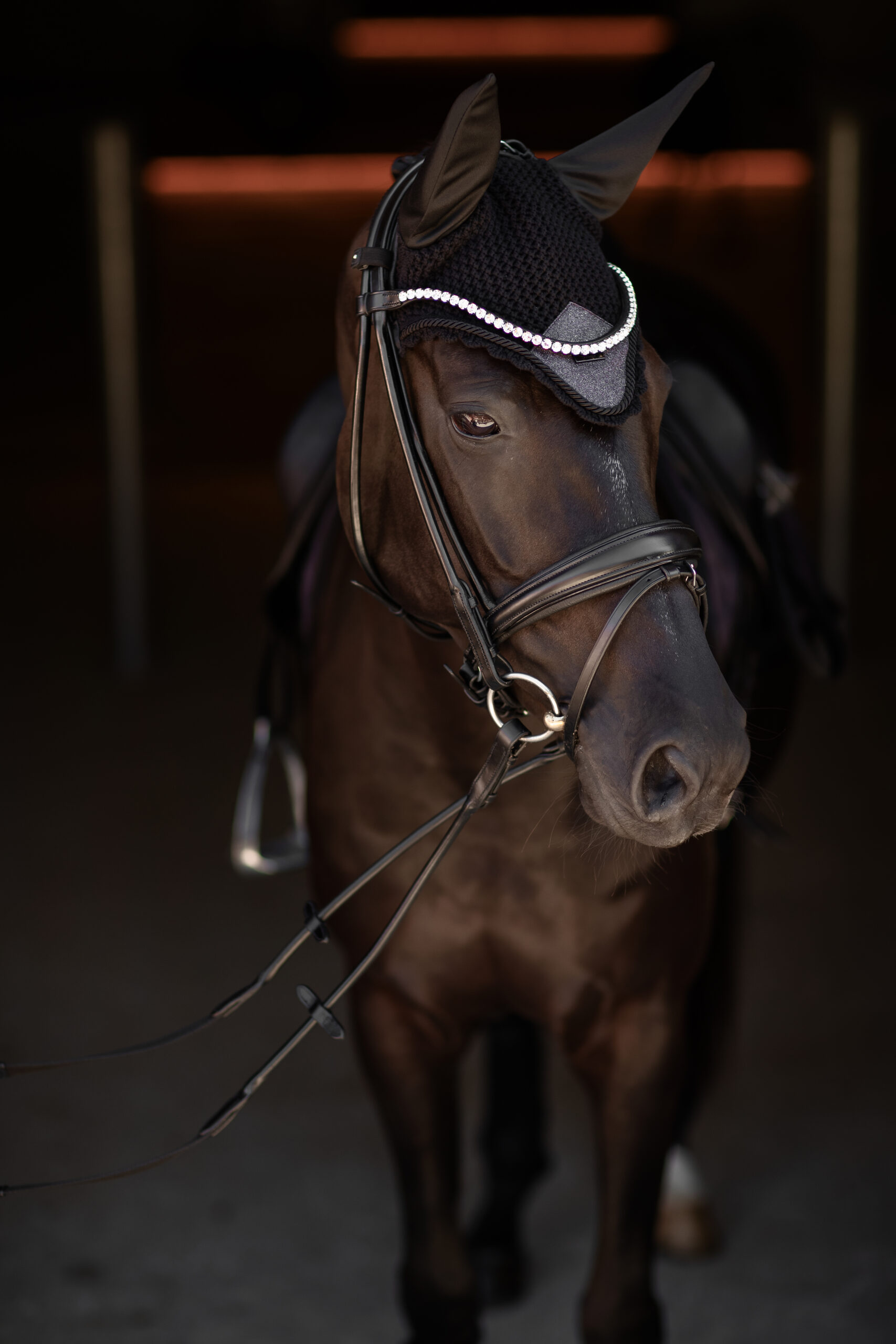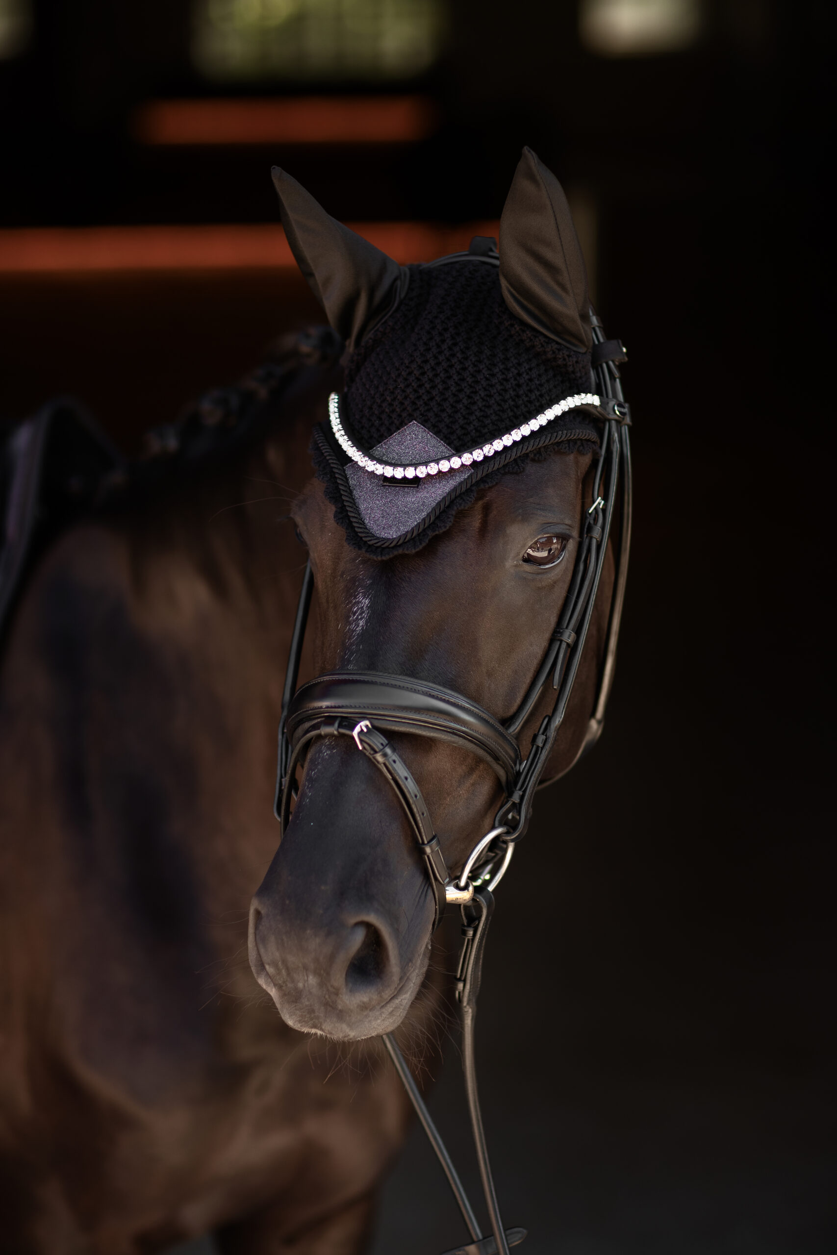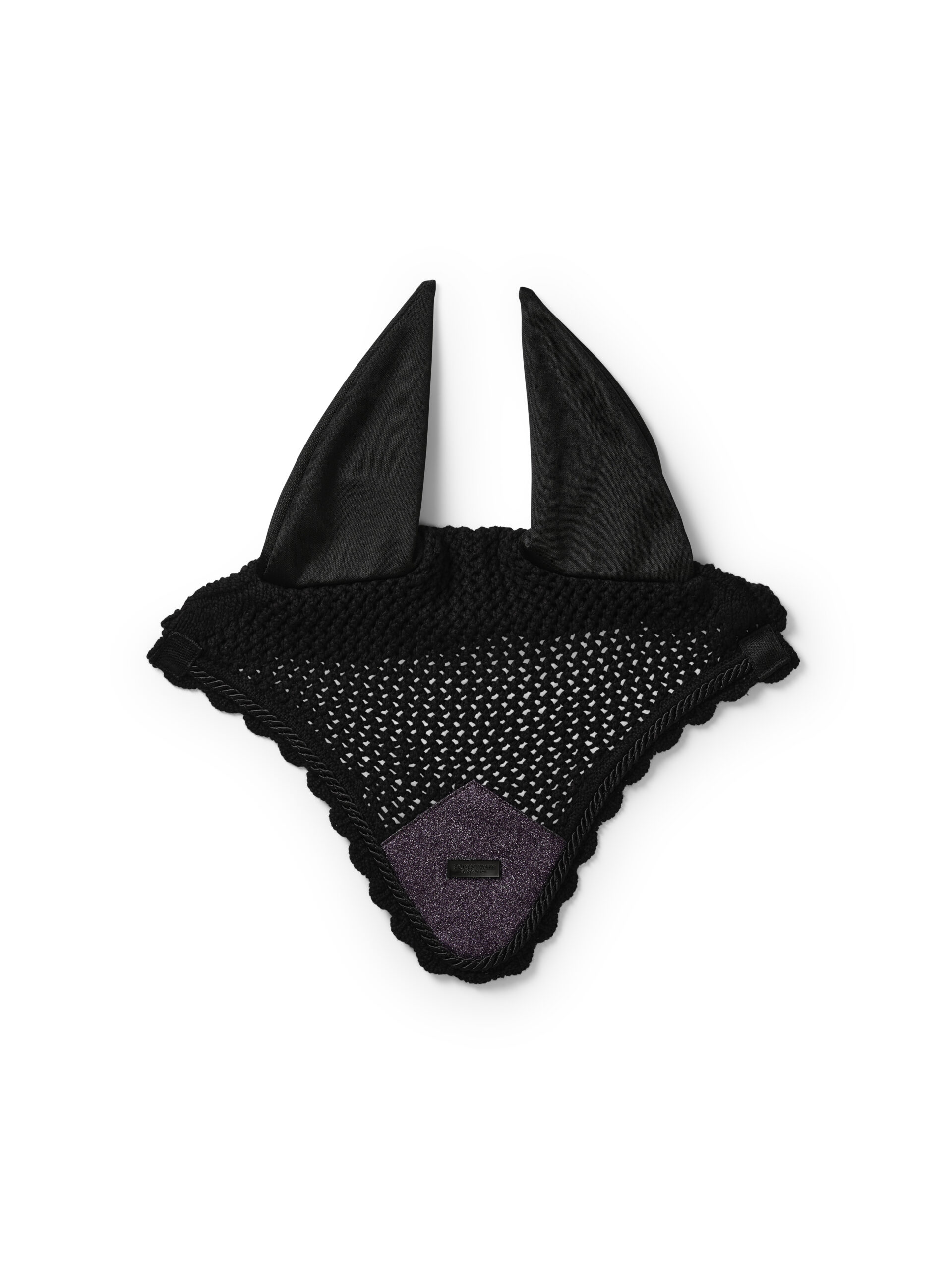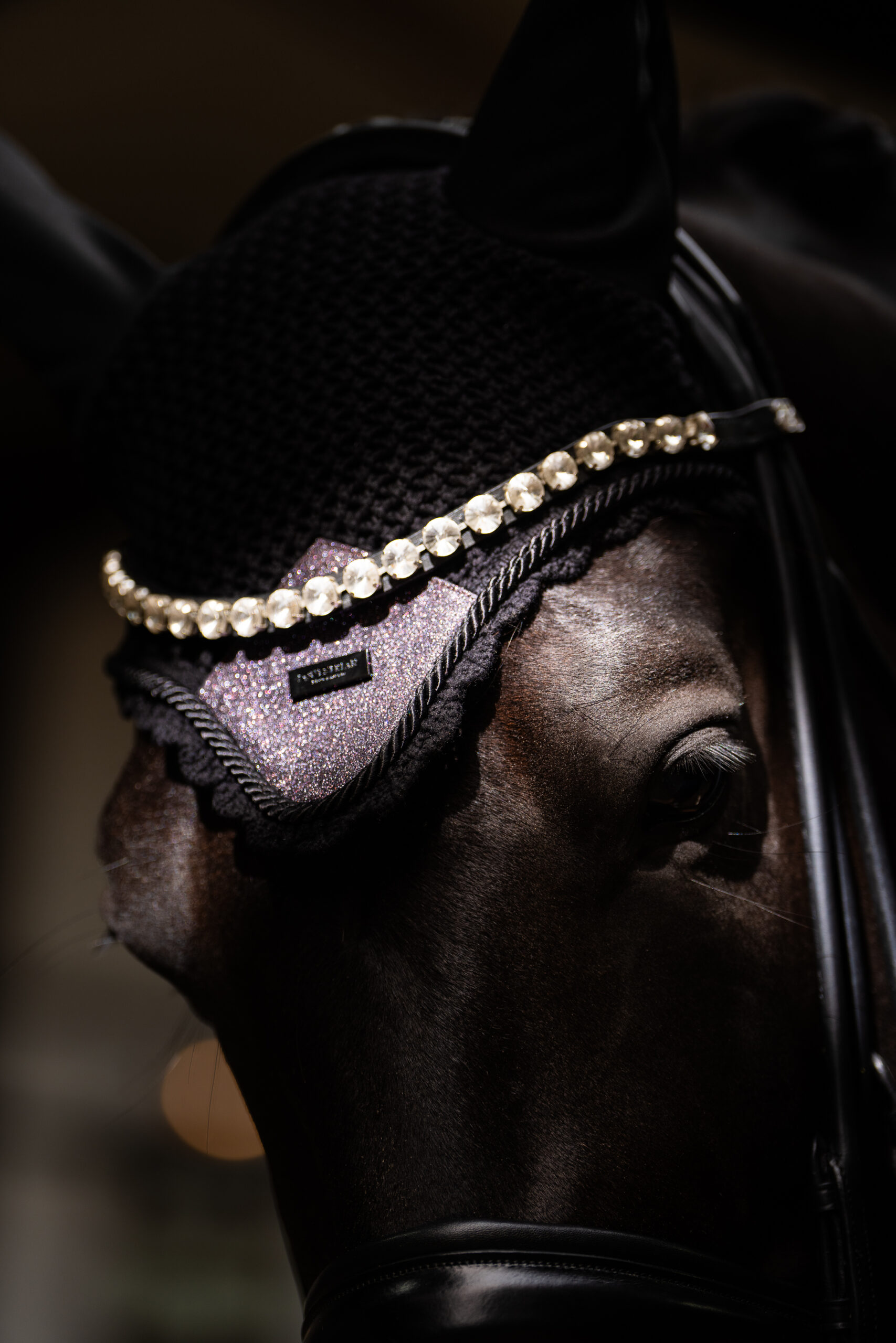 Elegáns fekete Equestrian Stockholm fülvédő lila csillogó részletekkel az elején, fekete zsinórral és fekete fém táblával. A fülvédő megvédi lovunk fülét a bogaraktól és a zavaró hangoktól. Horgolt, elasztikus anyagú fülrésszel. Könnyen rögzíthető, nem mozdul el.