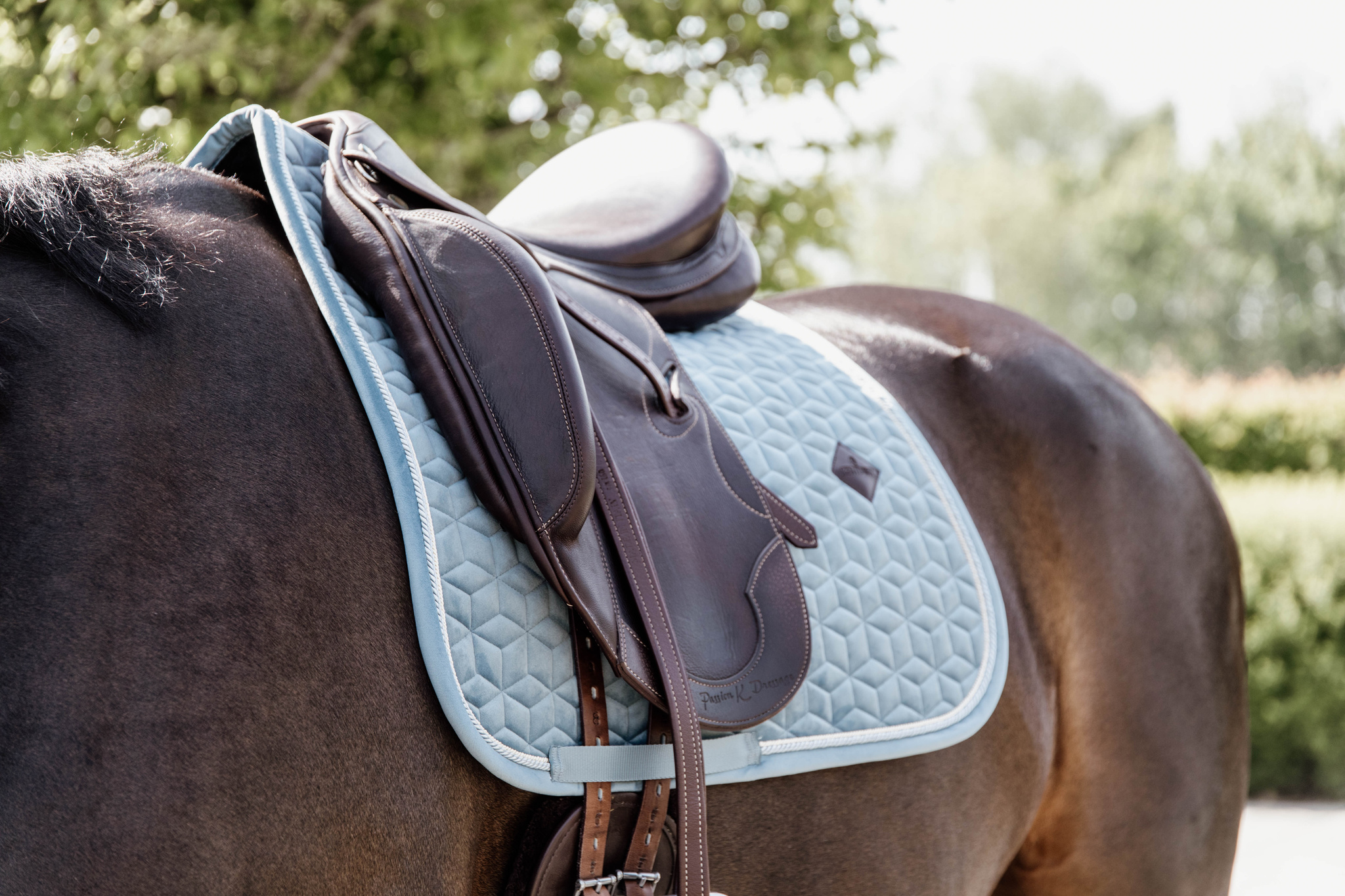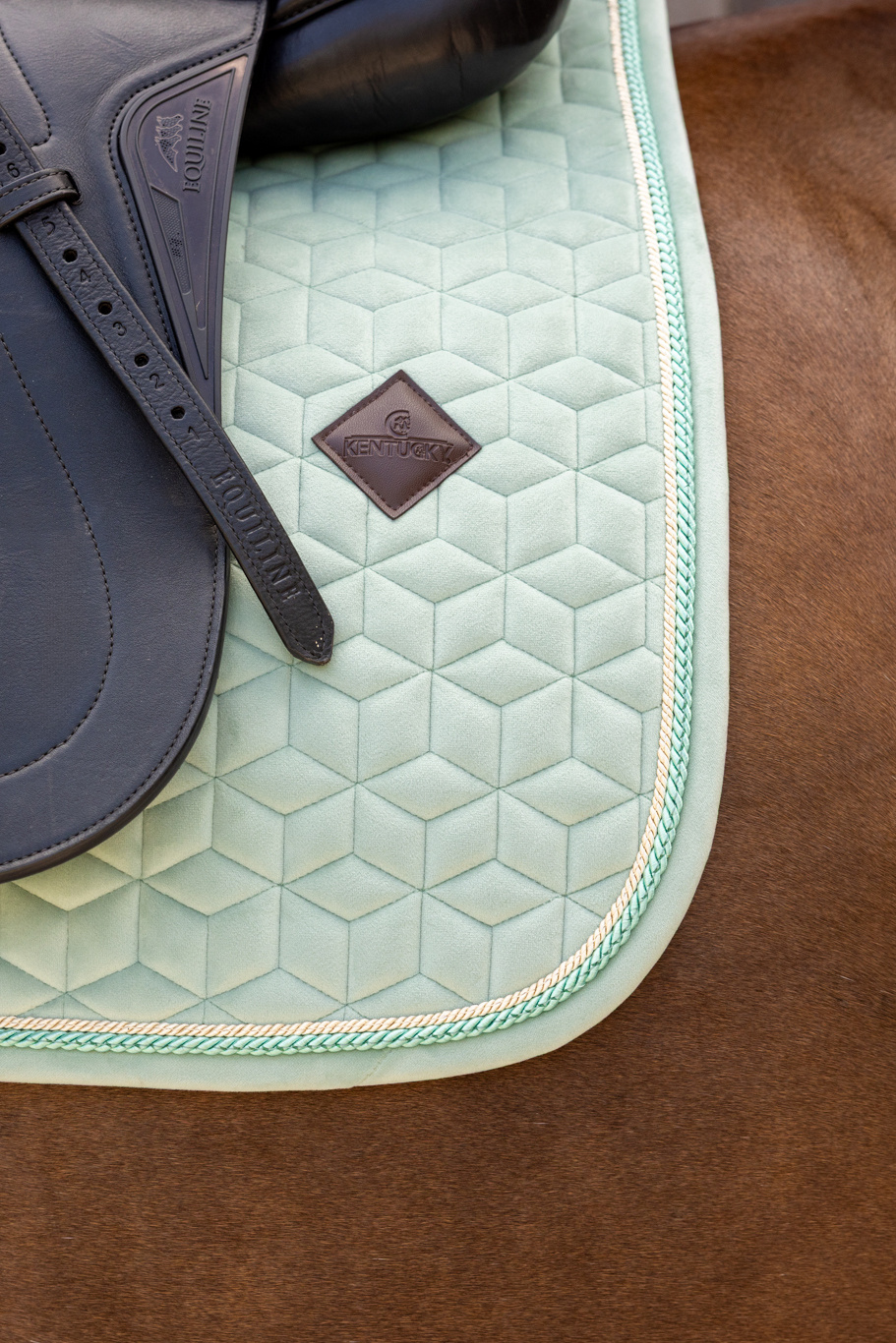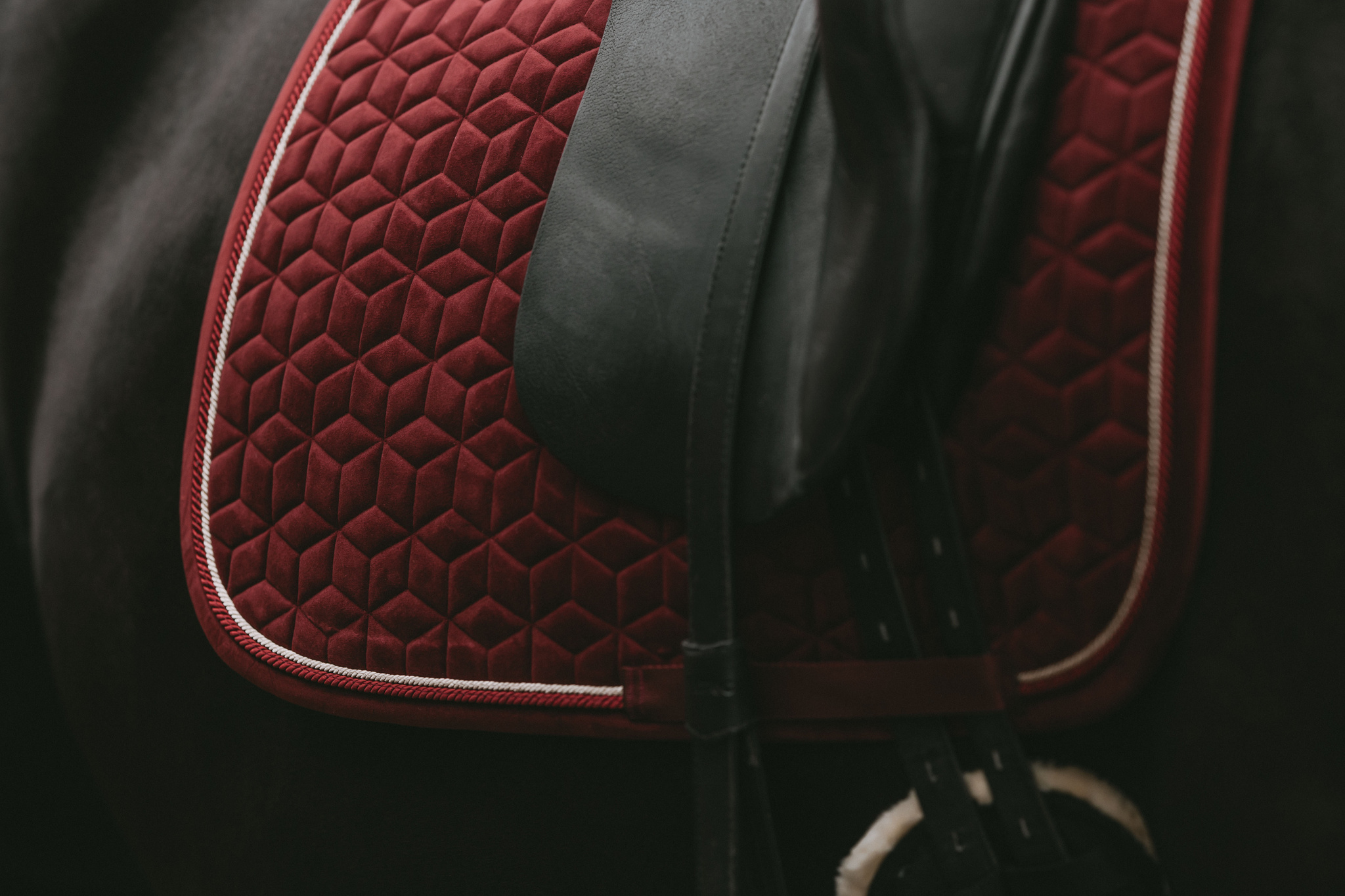 A nyeregalátét bársony anyagból készült, egyedi csillag alakú steppeléssel, dupla zsinóros díszítéssel igazán divatos megjelenést biztosít! Nincs zavaró tépőzár, csak egy nejlonpánt a hevederhez való rögzítéshez. Finom bőr logó, de igény szerint szponzori logó is könnyen elhelyezhető rajta.