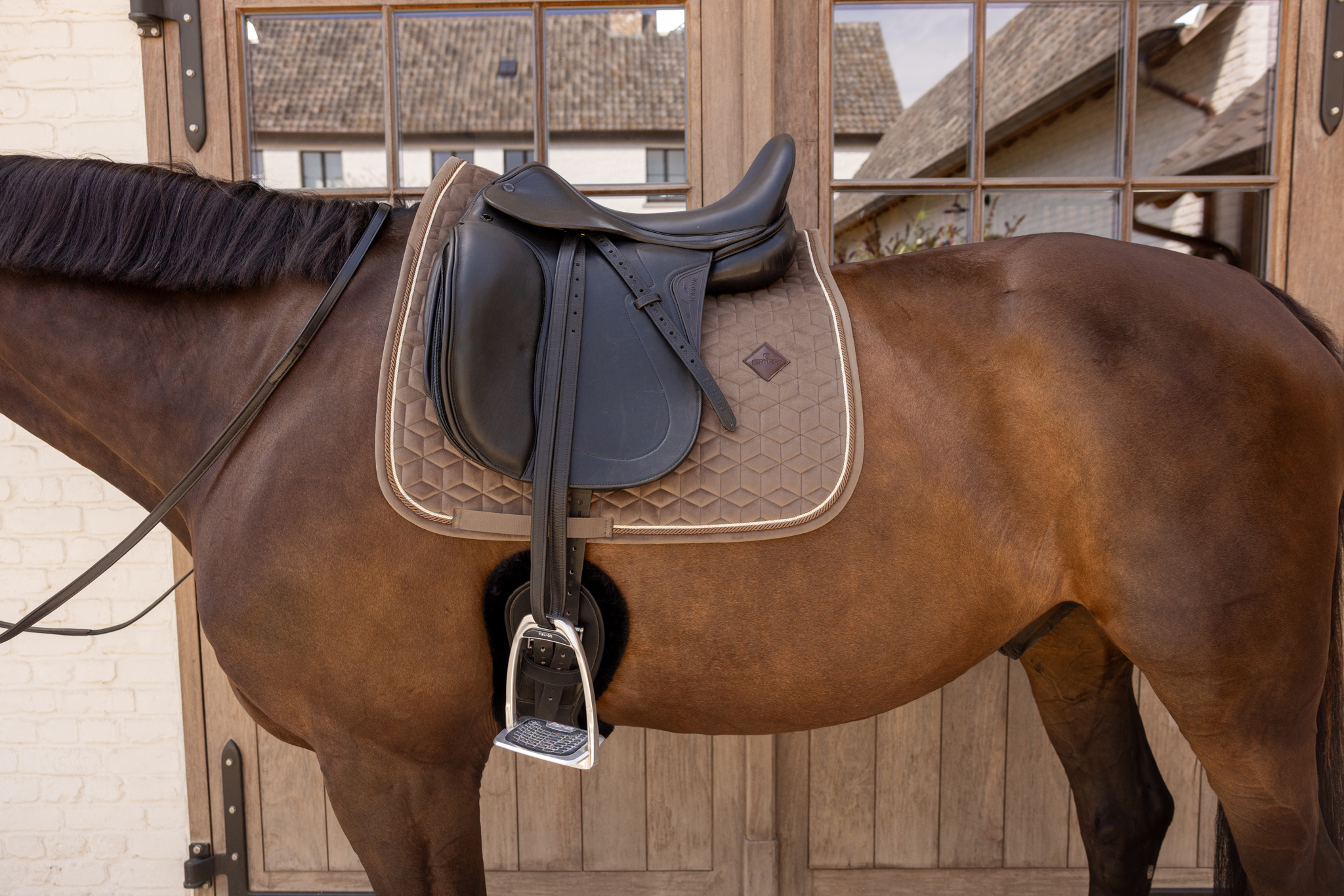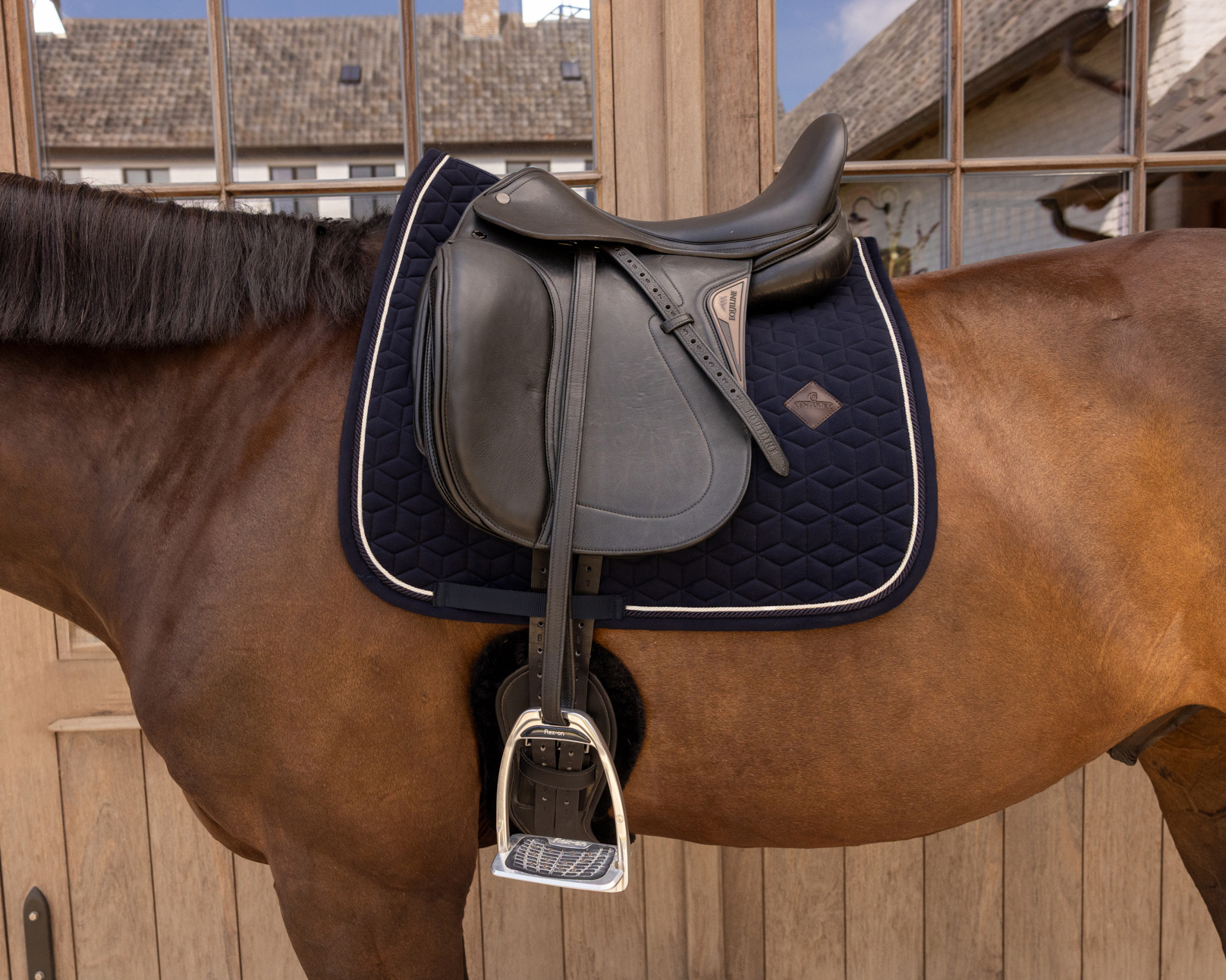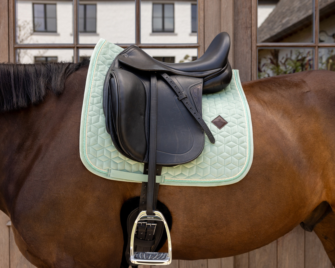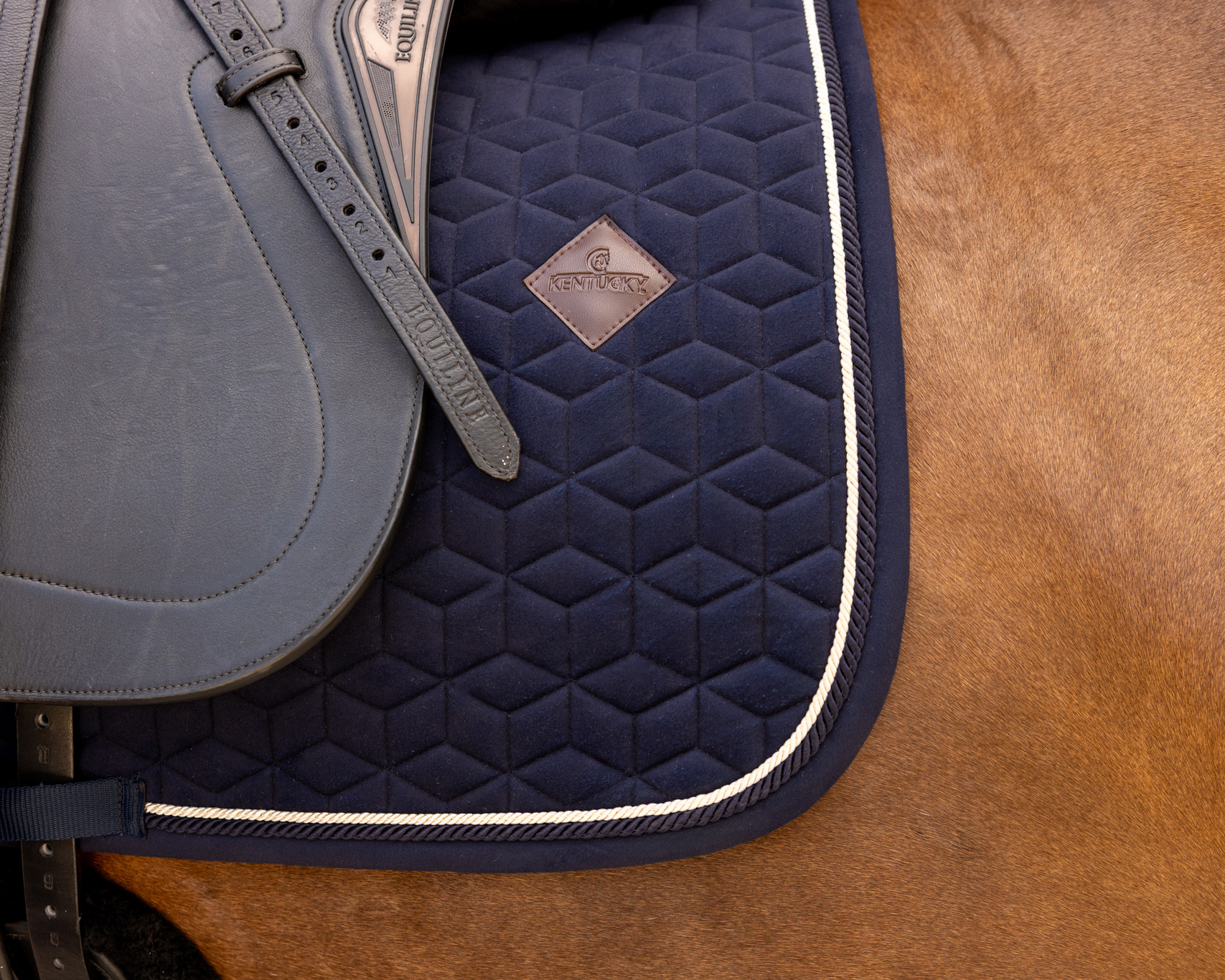 A nyeregalátét bársony anyagból készült, egyedi csillag alakú steppeléssel, dupla zsinóros díszítéssel igazán divatos megjelenést biztosít! Nincs zavaró tépőzár, csak egy nejlonpánt a hevederhez való rögzítéshez. Finom bőr logó, de igény szerint szponzori logó is könnyen elhelyezhető rajta.