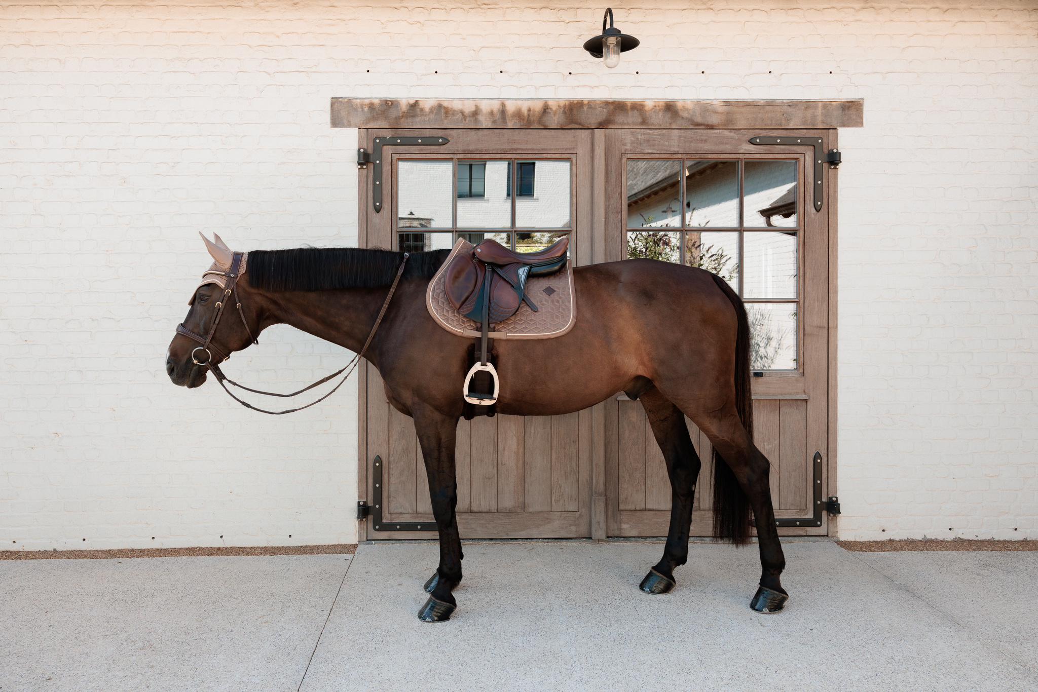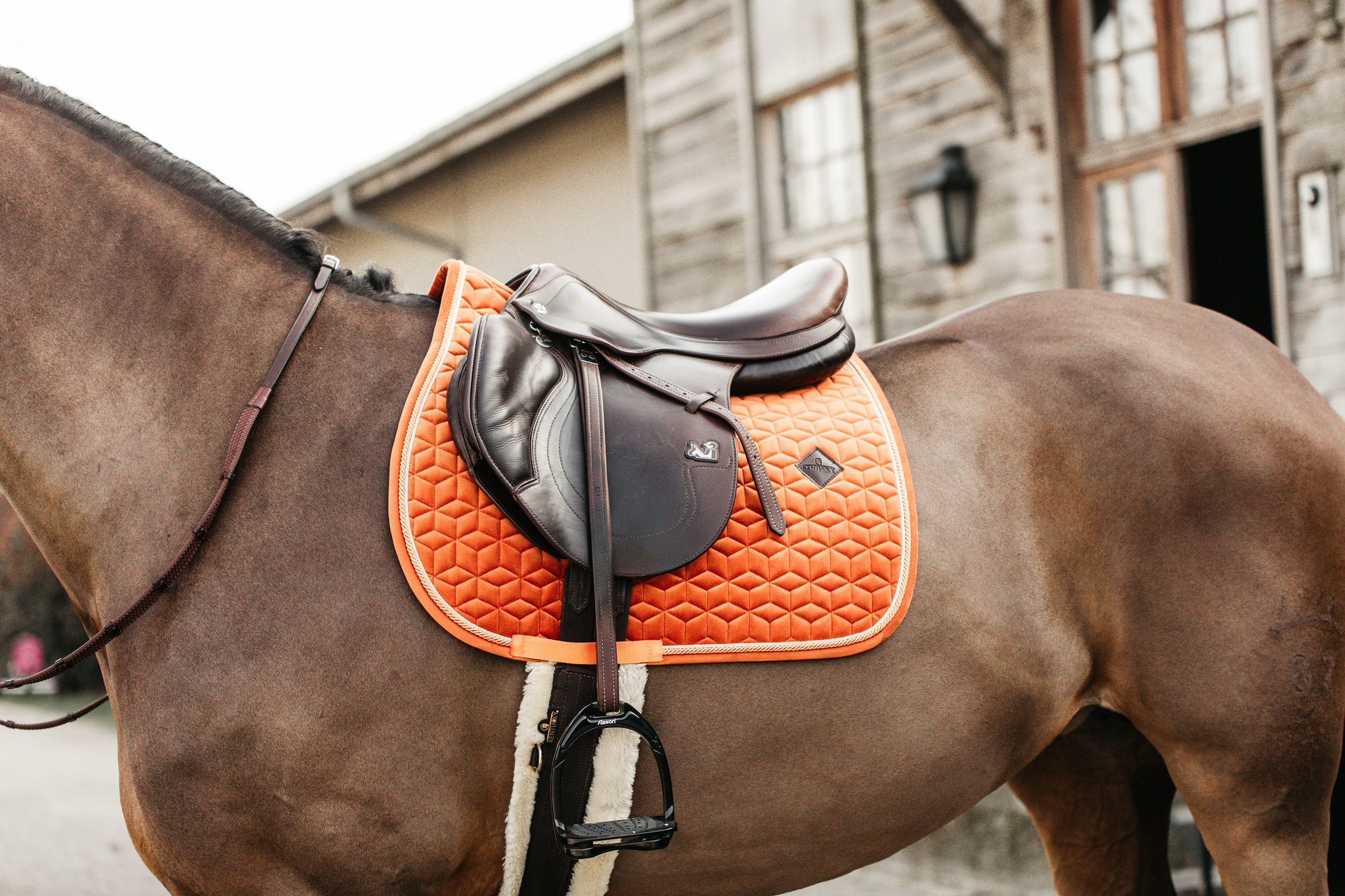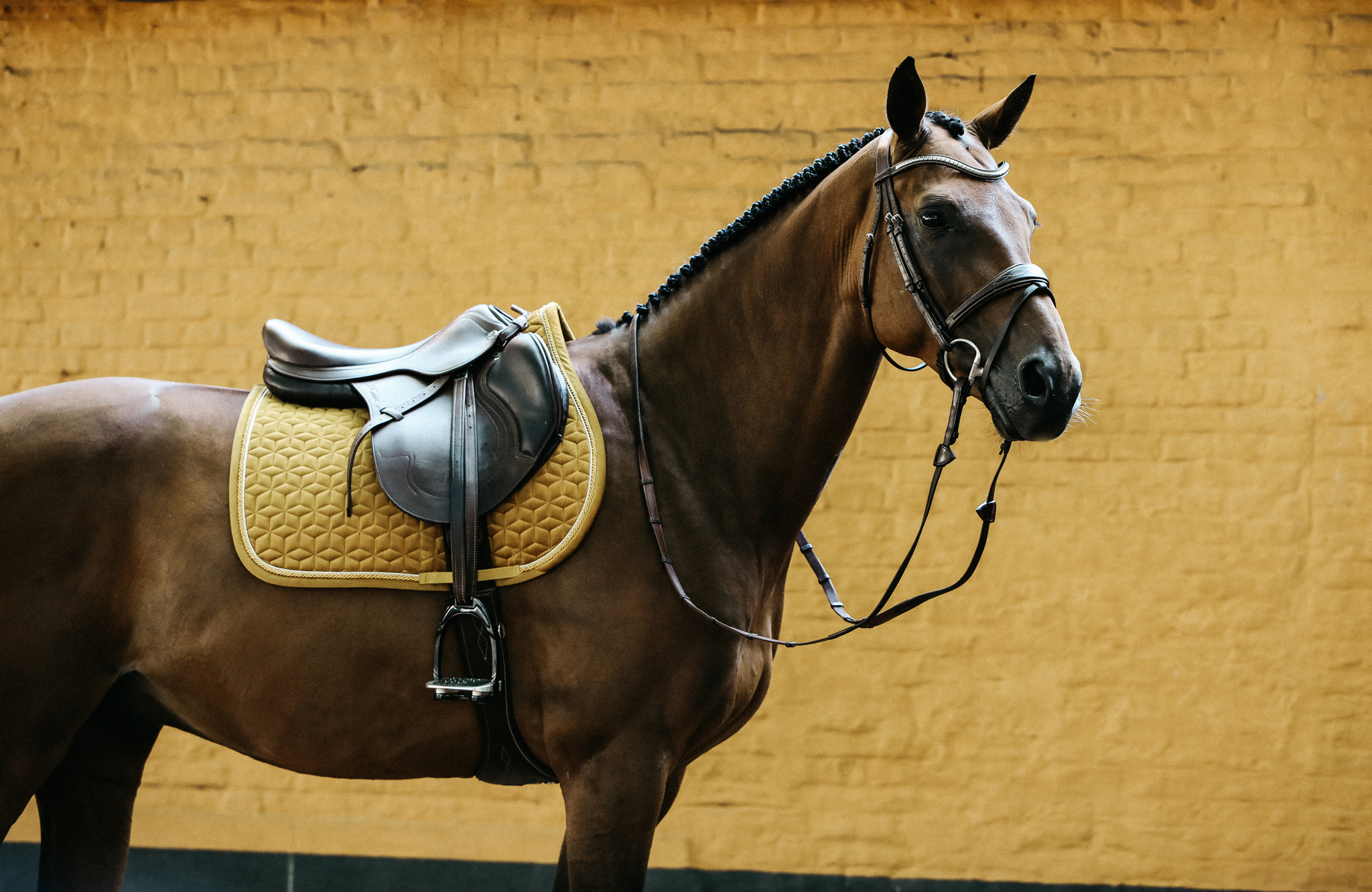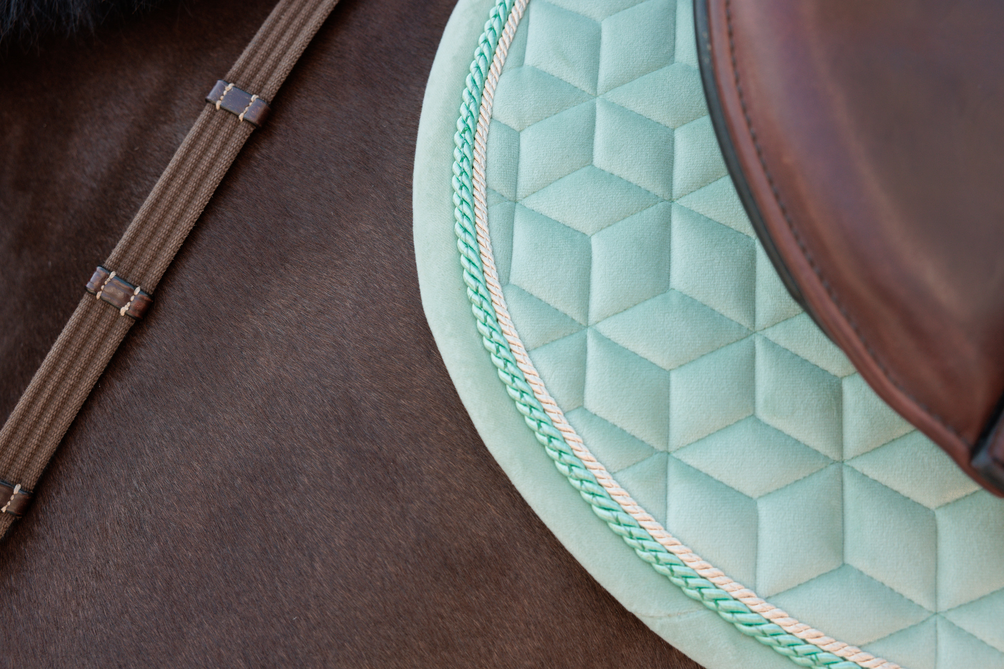 A nyeregalátét bársony anyagból készült, egyedi csillag alakú steppeléssel, dupla zsinóros díszítéssel igazán divatos megjelenést biztosít! Nincs zavaró tépőzár, csak egy nejlonpánt a hevederhez való rögzítéshez. Finom bőr logó, de igény szerint szponzori logó is könnyen elhelyezhető rajta.