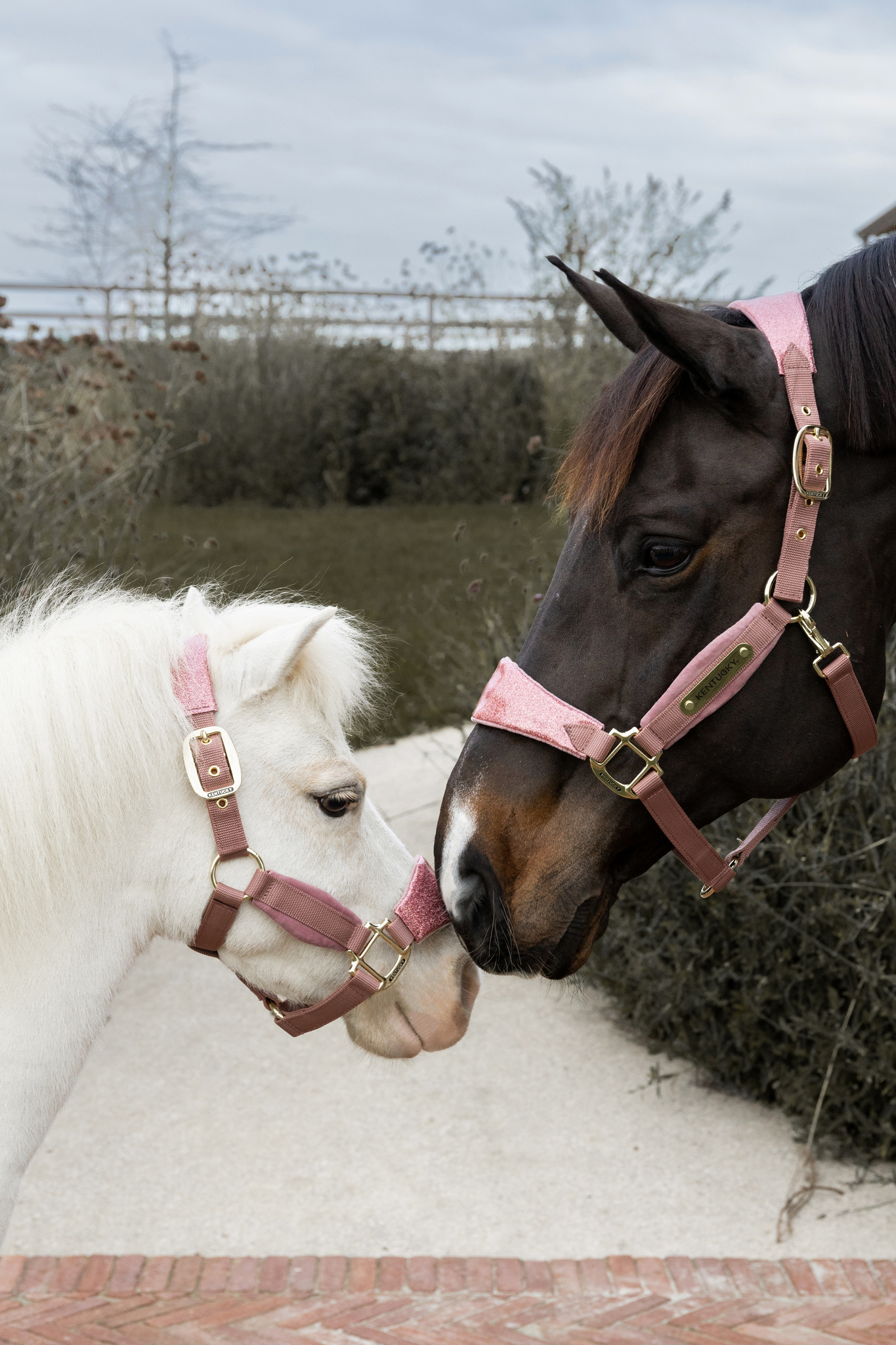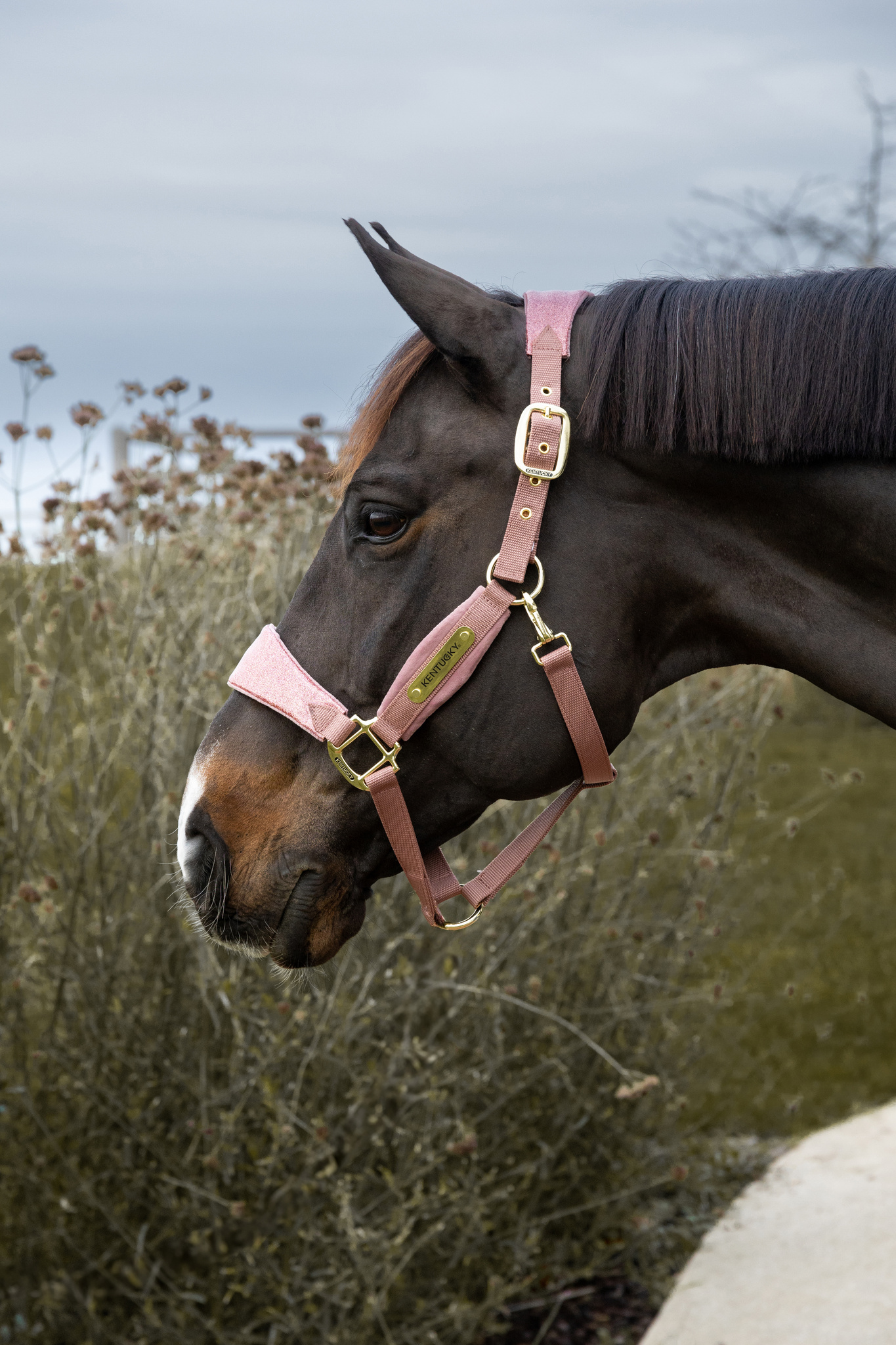 A kötőfék erős nejlonból készült, hogy garantálja lova biztonságát. Az orr, a pofa és a tarkórész bársonybetéttel van megerősítve. Ez nagyon puha tapintású és kényelmes viselet. A kötőfék arany sárgaréz karabinerrel záródik, a tarkó mindkét oldalán állítható a tökéletes illeszkedés érdekében.