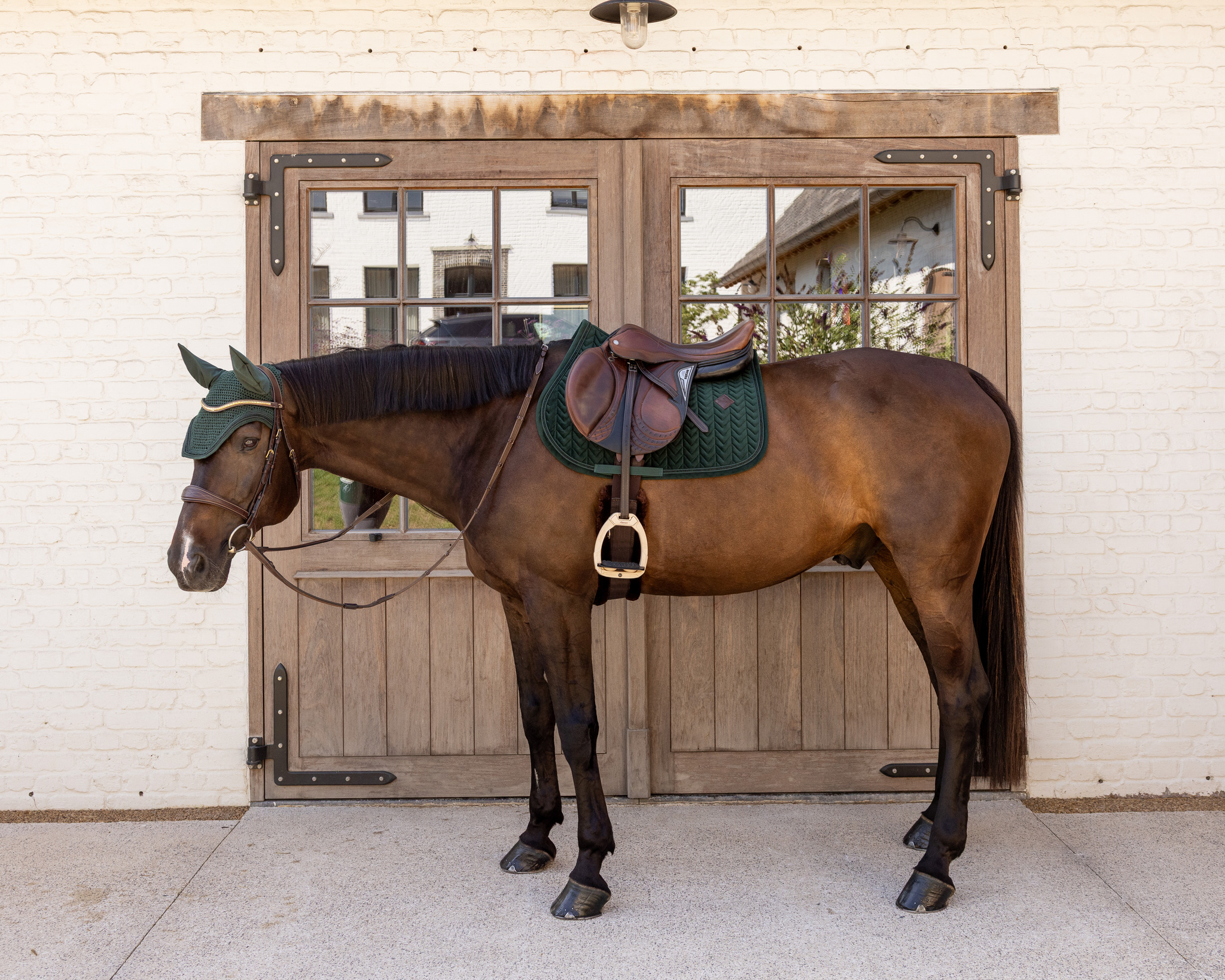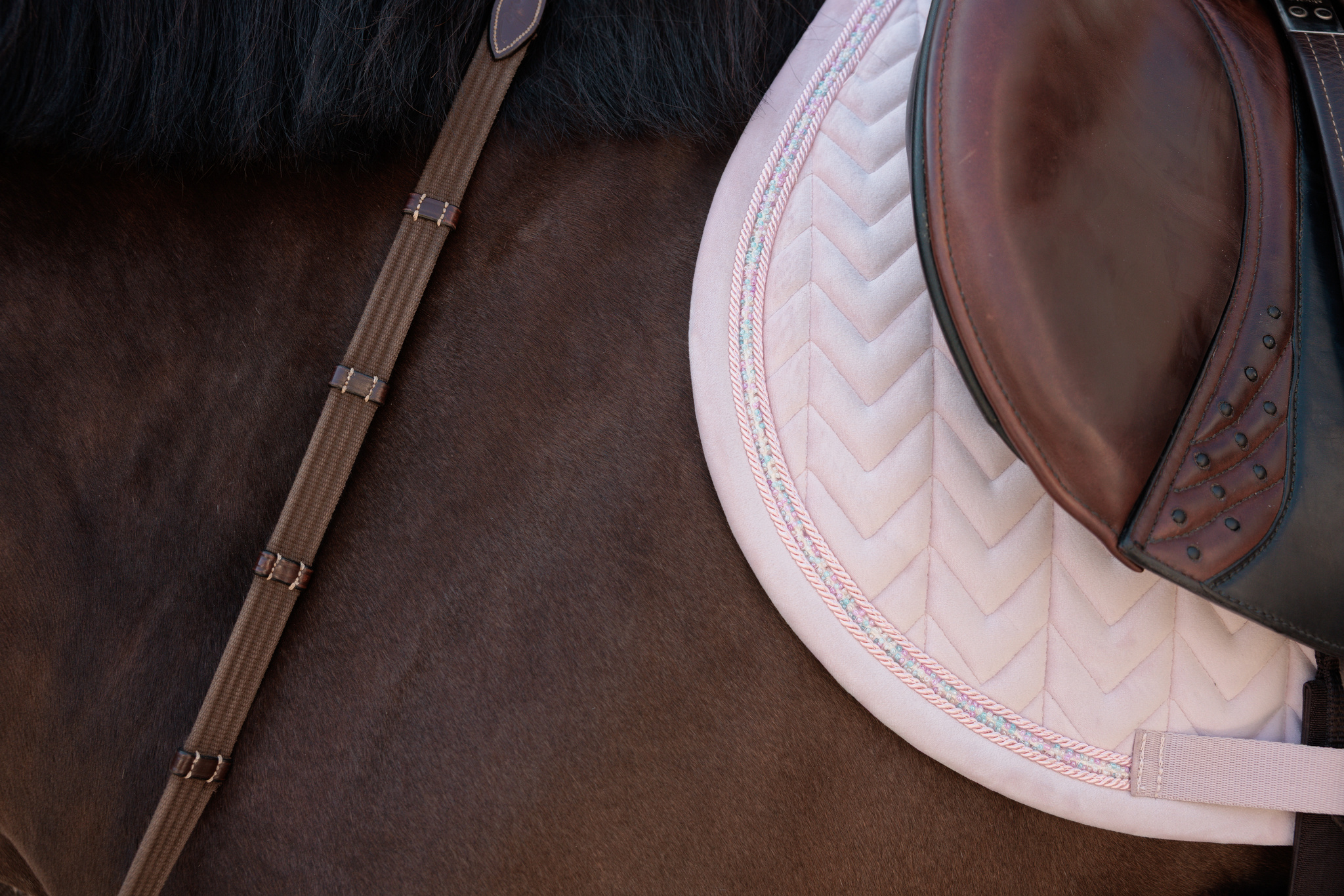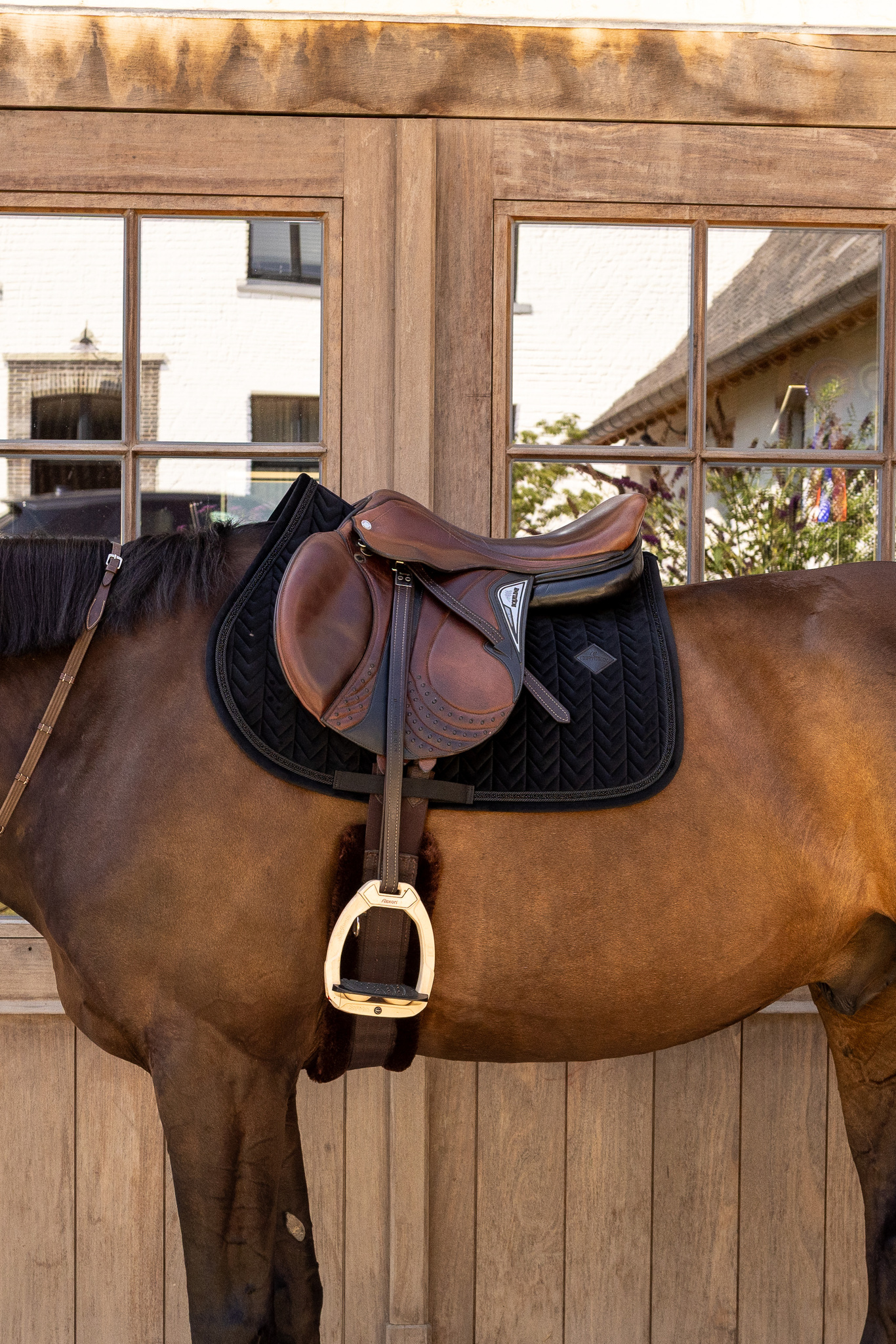 A Kentucky Horsewear Velvet Mini Pearls nyeregalátét egy időtlen darab, amelyet a kifinomult részleteket értékelő lovasok számára terveztek. Ikonikus Kentucky bársony kollekció része, jellegzetes halszálkamintás steppeléssel. A pamut és poliészter bélés optimális lélegzőképességet és nedvszívó képességet biztosít, így lovat kényelmesen és szárazon tartja. Elegáns mini gyöngyökkel, amelyek finom csillogást adnak. Tegye teljessé a megjelenést a hozzá illő Wellington fülvédőkkel a maximális harmónia érdekében.