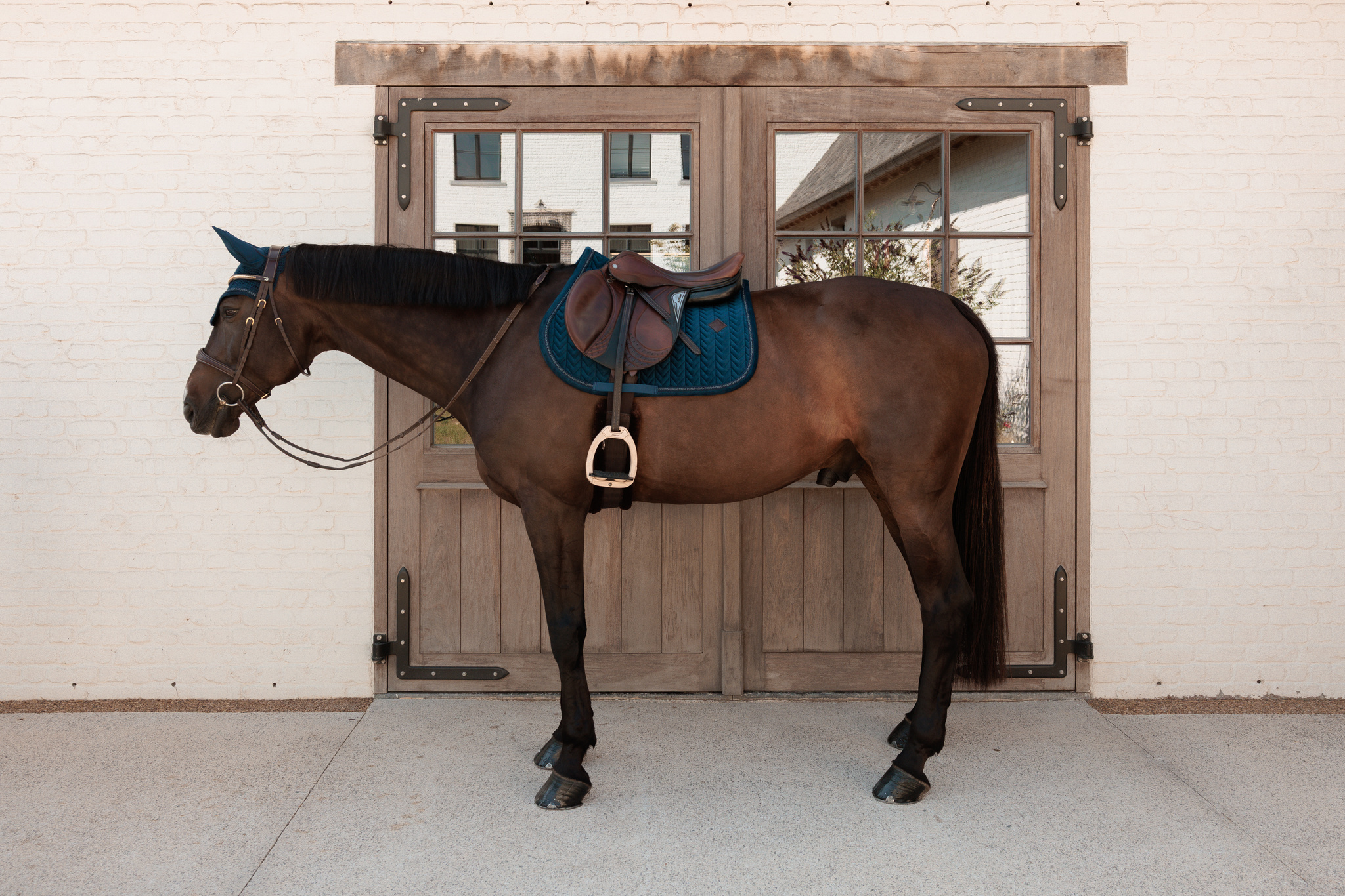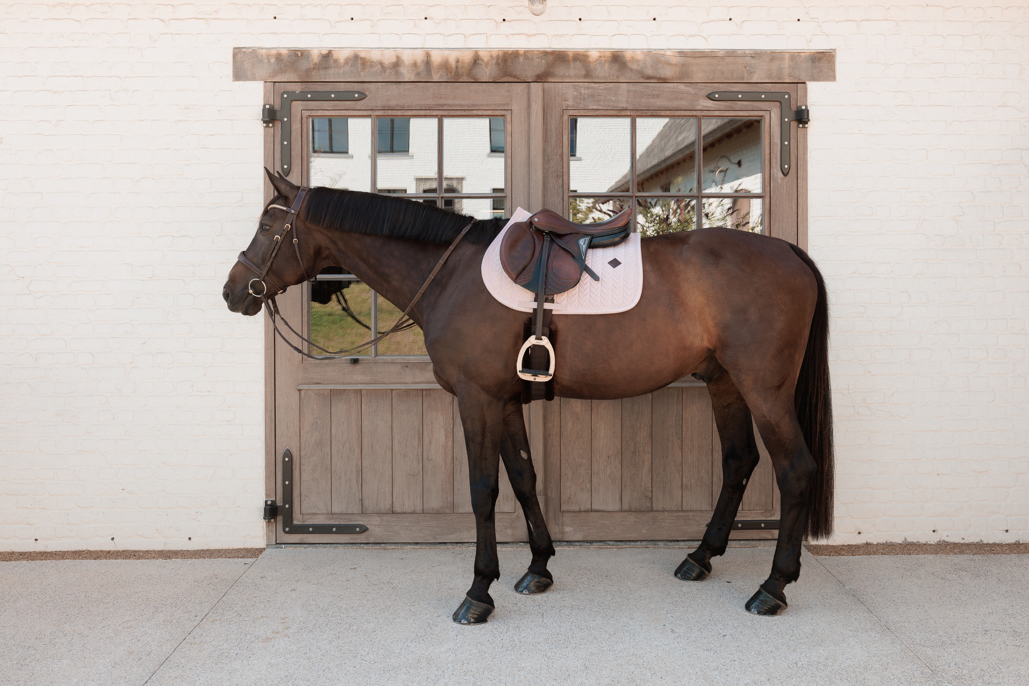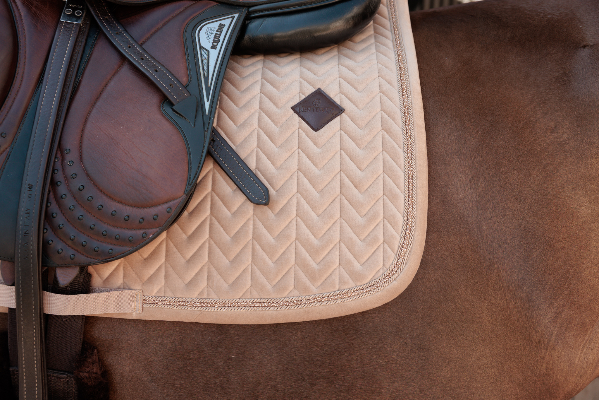 A Kentucky Horsewear Velvet Mini Pearls nyeregalátét egy időtlen darab, amelyet a kifinomult részleteket értékelő lovasok számára terveztek. Ikonikus Kentucky bársony kollekció része, jellegzetes halszálkamintás steppeléssel. A pamut és poliészter bélés optimális lélegzőképességet és nedvszívó képességet biztosít, így lovat kényelmesen és szárazon tartja. Elegáns mini gyöngyökkel, amelyek finom csillogást adnak. Tegye teljessé a megjelenést a hozzá illő Wellington fülvédőkkel a maximális harmónia érdekében.
