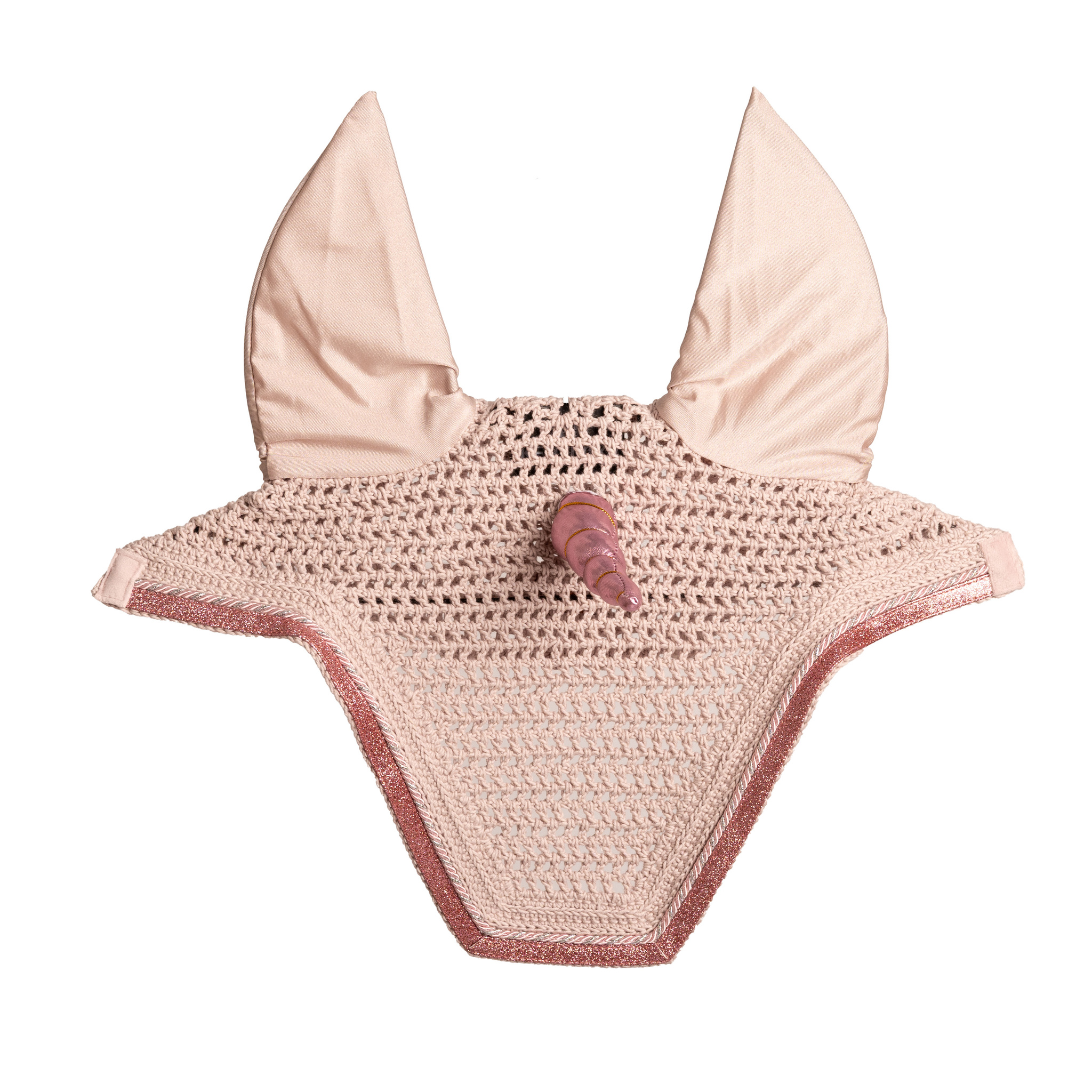 Vondd magadra a tekinteteket a pályán vagy lovaglás közben ezzel a varázslatos Kentucky Horsewear csillogó unikornisos fülvédővel! A design egy csipetnyi varázslatot visz lovad öltözékébe, gyönyörűen kidolgozott rózsaszín szarvval és csillogó glitter részletekkel. A lágy rózsaszín szín bármilyen szőrszínhez illik, a lélegző anyag kényelmet biztosít lovadnak.