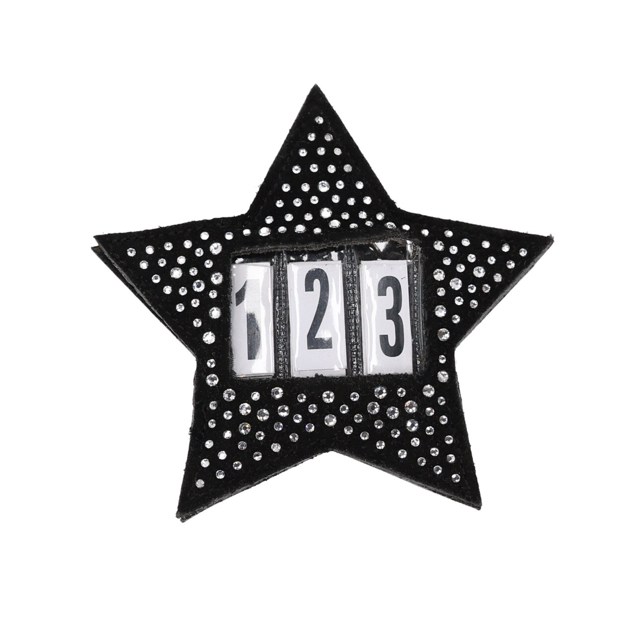 Gyönyörű csillag alakú QHP számtartó, csillogó strasszokkal díszítve. Könnyen rögzíthető a kantárhoz vagy a nyeregalátéthez a biztosítótű vagy tépőzár segítségével. Cserélhető számokkal.